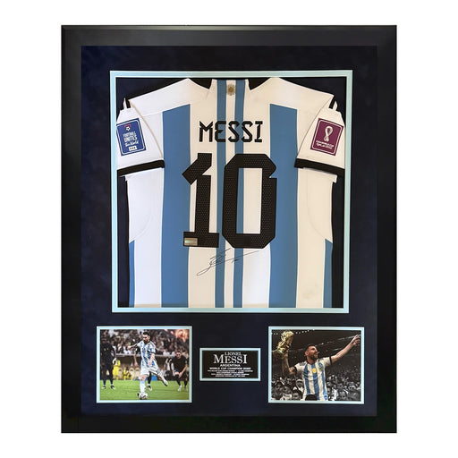 View full detailsThis 2022 home shirt framed to 32x40 has been personally hand signed by Lionel Messi of Argentina 100% Authentic Certificate of authenticity by Ico...