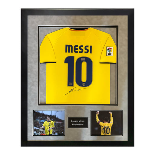 View full detailsThis 2008-2010 away shirt framed to 32x40 has been personally hand signed by Lionel Messi of FC Barcelona 100% Authentic Certificate of authenticit...