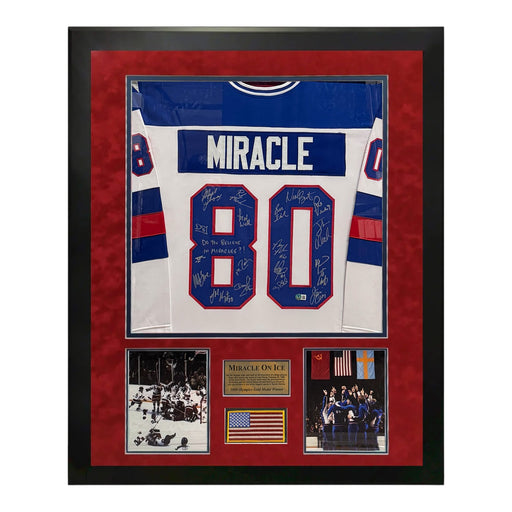 View full detailsThis jersey framed to 32x40 has been personally hand signed by Jim Craig, Mark Johnson, Mike Eruzione, Steve Janaszak, Ken Morrow, Mike Ramsey, Bil...