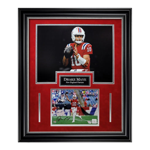 View full detailsThis 8x10 photo collage framed to 23x27 has been personally hand-signed by Drake Maye of the New England Patriots 100% Authentic Certificate of au...