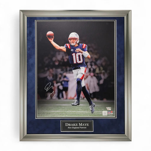 This 8x10 photograph framed to 11x14 has been personally hand-signed by Drake Maye of the New England Patriots 100% Authentic Certificate of authe...