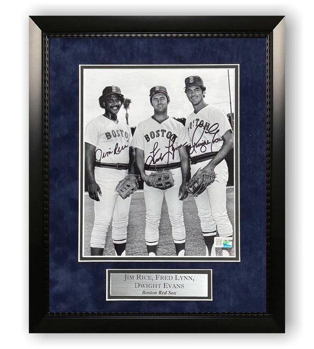This 8x10 photo custom framed to 11x14 has been personally hand-signed by Fred Lynn, Jim Rice & Dwight Evans of the Boston Red Sox