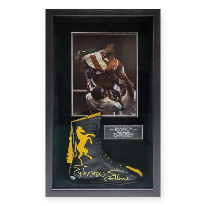 This boxing shoe shadowbox framed to 18x26 has been personally hand signed by Sylvester Stallone