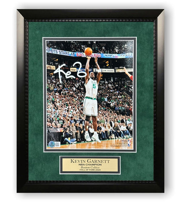 This 8x10 photo custom framed to 11x14 has been personally hand-signed by Kevin Garnett of the Boston Celtics