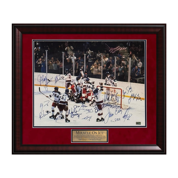 This photograph framed to 23x27 has been personally hand signed by Jim Craig, Mark Johnson, Mike Eruzione, Steve Janaszak, Ken Morrow, Mike Ramsey, Bill Baker, Rob McClanahan, Dave Silk, Neal Broten, Jack O'Callahan, Eric Strobel, Dave Christian, Buzz Schneider, John Harrington & Phil Verchota
